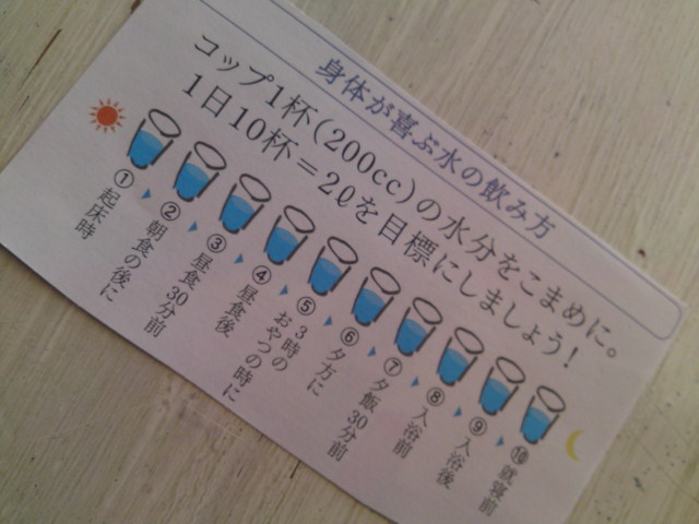 もちろん個人差はあると思いますよ! このペーパーは、ダスキンさんの新聞に載っていました。 1日10杯=2ℓを目標に! と書いてありますね☆ 私はここ1ヵ月くらい、毎日だいたい3.5ℓ位のお水を飲んでいます。 最初は、飲みなれなくてきつく感じることもあったのですが、 だんだん慣れてきて、最近では、お水がスーッと身体に流れるのを感じ気持ちよくもあります☆★☆ 連日の猛暑。 日本全国で熱中症にかかられた方も多いようです。 室内の中でかかる方も少なくないそうですね。 皆さまも水分補給をこまめに摂られ、夏日を楽しんでくださいね☆★☆